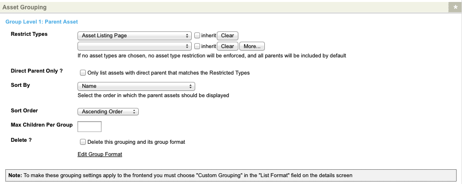 The first problem is that the grouped asset listing naturally lists any subparents and the children of those subparents. If I am going to show the second tier in my tree using a nested asset listing, I'm going to need to prevent that second tier appearing in the top level grouped asset listing.