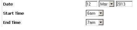 <SELECT onblur=“currentField=null; oldField=this; setTimeout(‘processStartDateBlur(oldField, 'calendar_event_single_0')’, 10);” id=calendar_event_single_0_duration class=sq-form-field onfocus=currentField=this onkeypress=processKeyEvent(this) name=calendar_event_single_0_duration> <OPTION value=7>7am</OPTION> <OPTION value=8>8am</OPTION> <OPTION value=9>9am</OPTION> <OPTION value=10>10am</OPTION> </SELECT>