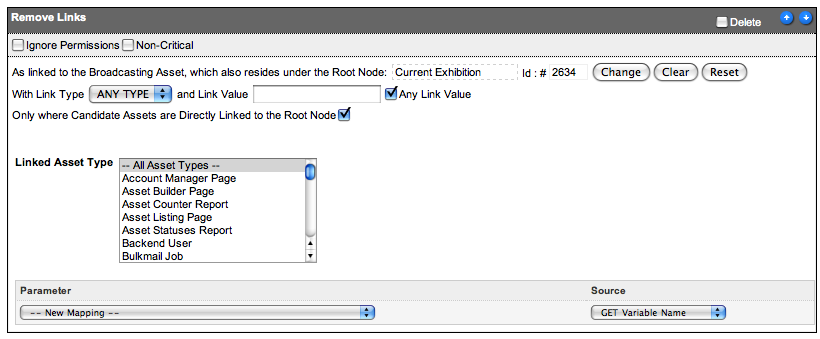 [quote]Which version are you using? We had to add a "direct links only" flag recently as you couldnt do what you usually wanted otherwise. With this flag set it will remove the links that are exactly from the specified asset. Otherwise it removes assets that are tree descendants of the specified asset which is more useful if you want to remove links from say under the site not the media folder.