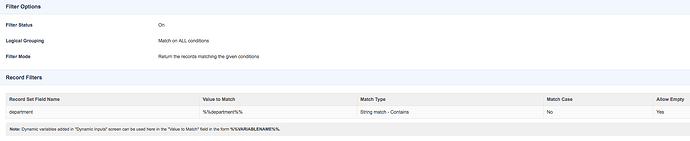 Somehow the value is still getting messed up. If I enter “Visual Arts” into the “Value to Match” it works correctly, but using the %%department%% replacement doesn’t work, even with the Set Value suggestion.
